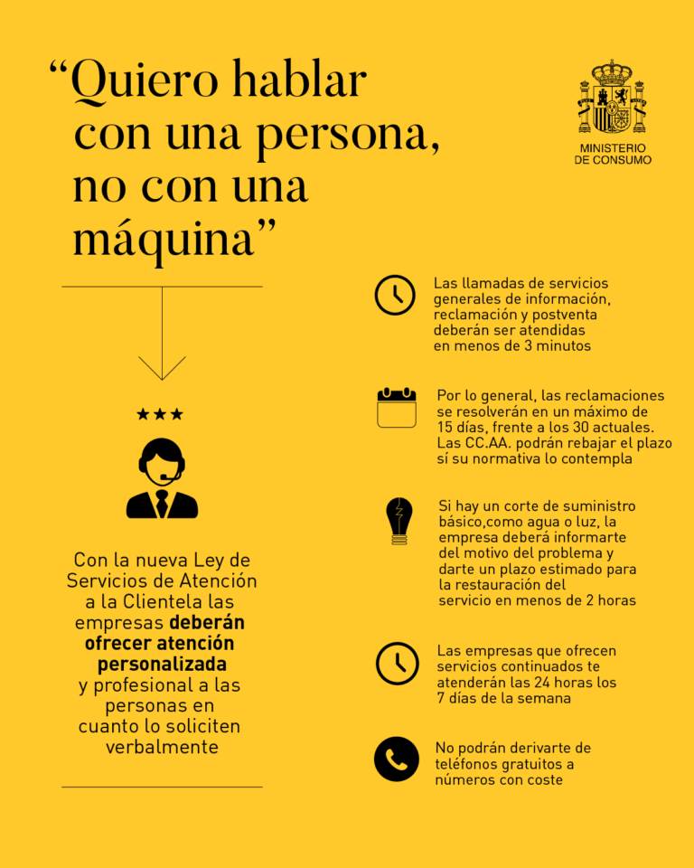 El objetivo general de la nueva Ley es garantizar los derechos básicos de los consumidores y establecer unos parámetros mínimos de calidad que deberán cumplir los servicios de atención al cliente. Algunos de sus puntos clave son los siguientes:
